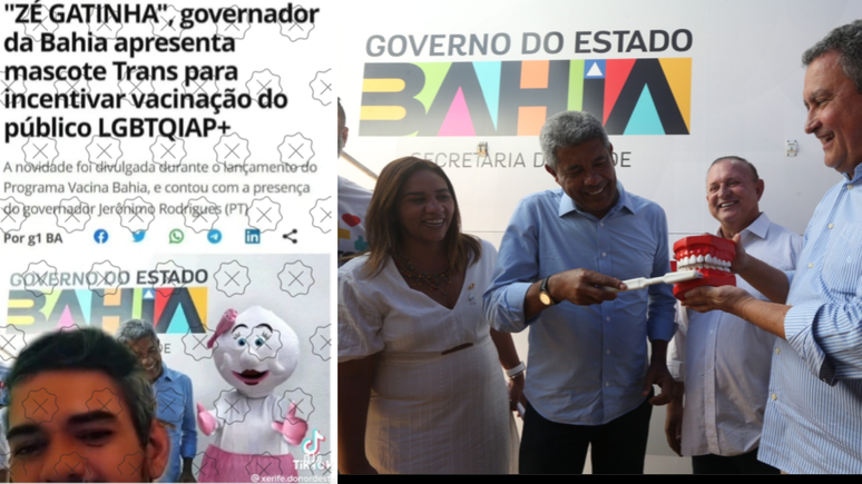 É falso que o governo da Bahia criou uma mascote trans chamada Zé Gatinha para incentivar a vacinação de pessoas LGBTQIA+, como afirma um homem em vídeo nas redes. A suposta reportagem que aparece ao fundo da gravação é uma montagem que simula o G1; a foto da boneca foi inserida digitalmente sobre o registro de um evento com o governador Jerônimo Rodrigues (PT) em Campo Formoso (BA) em fevereiro.