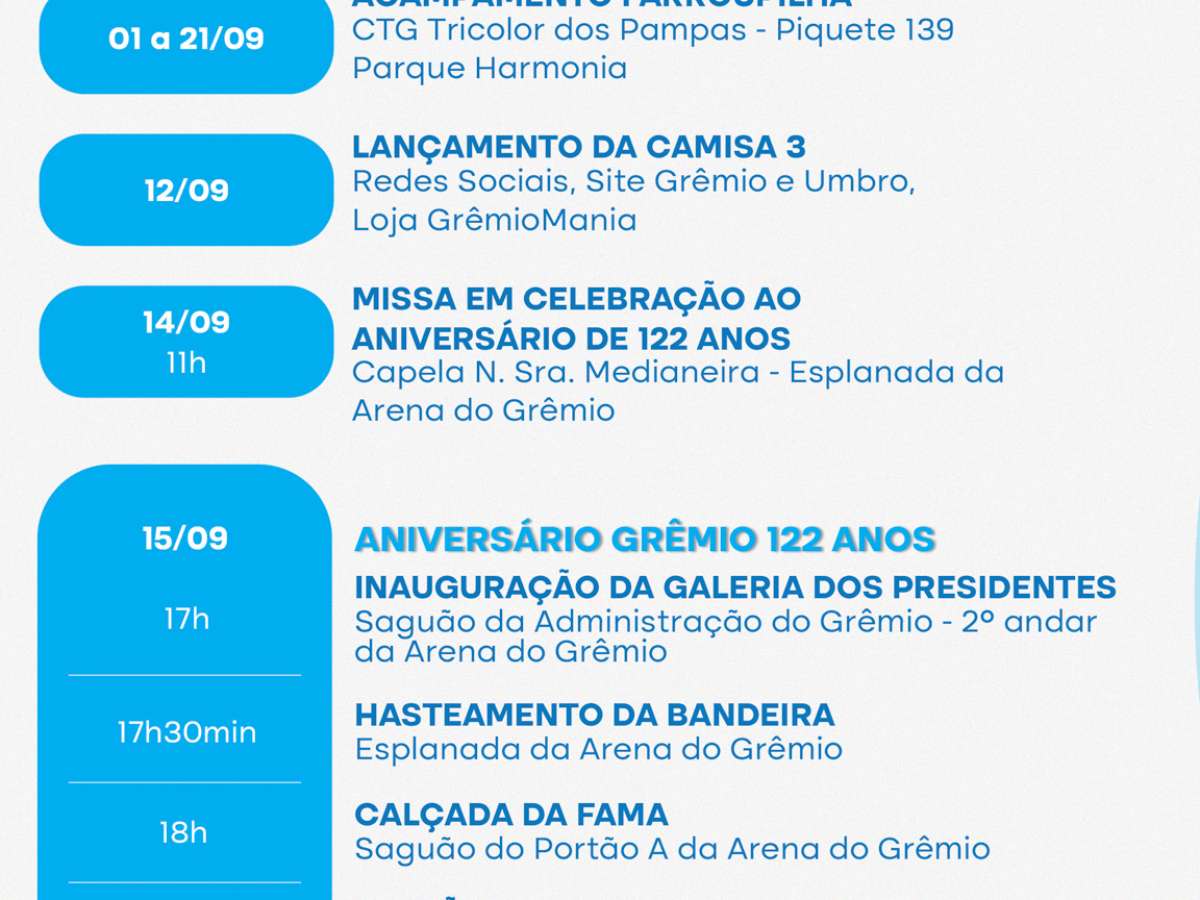 Já no dia 12, acontecerá o lançamento oficial da terceira camisa do time em 2025, com divulgações nas plataformas digitais, bem como na GrêmioMania Megastore. E no dia 14, às 11h, ocorre a clássica missa em celebração ao aniversário do Clube, na Capela N. Sra. Medianeira, na Esplanada da Arena.