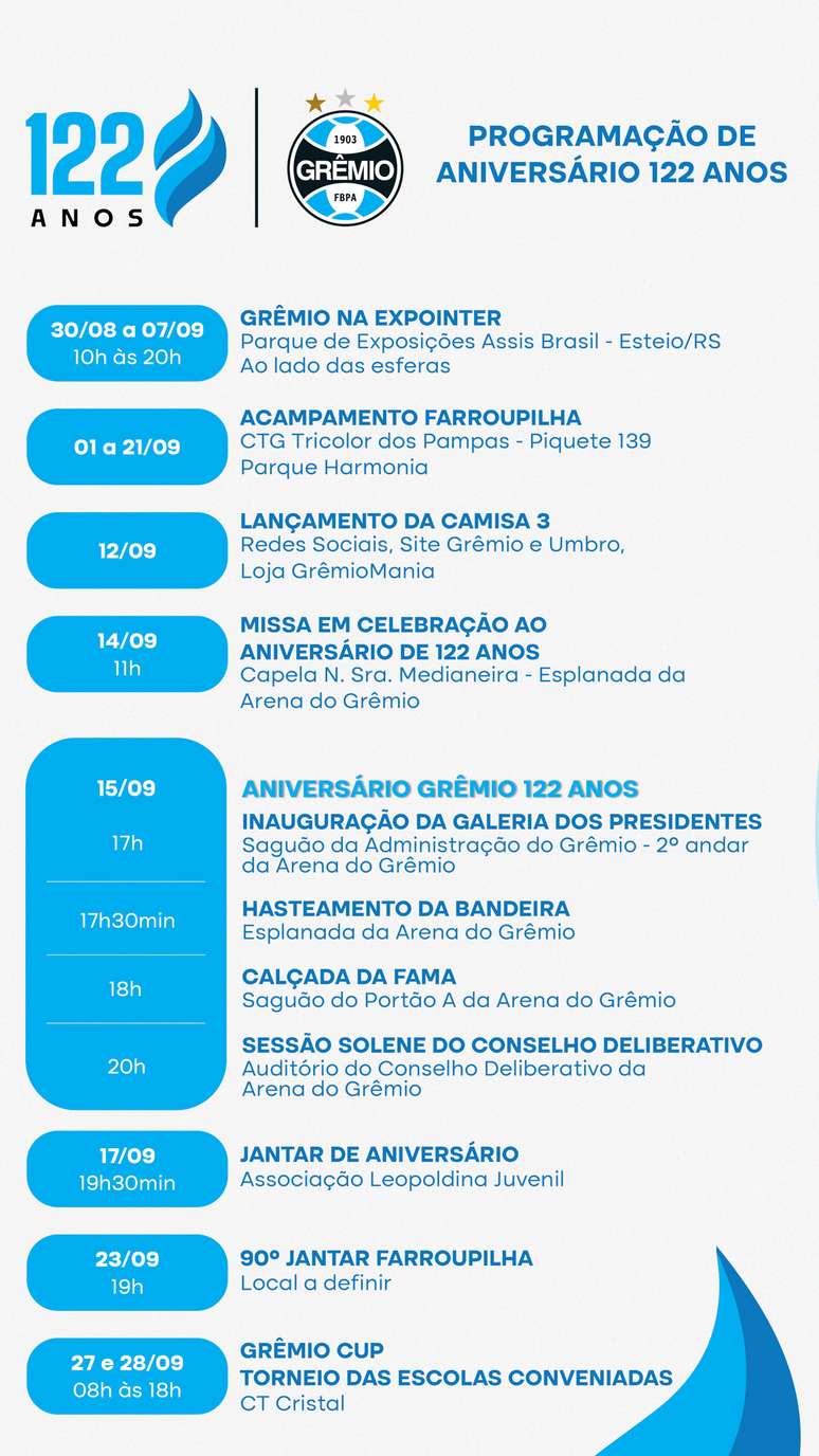 "Em 15 de setembro de 1903 foi acesa uma chama que jamais se apagará. Que queima um azul perfeito. O fogo da paixão de milhões. Mesmo após 122 anos, a chama segue forte. Cada vez mais viva. Mais gremista". Assim é apresentado o conceito das celebrações do aniversário do Grêmio neste ano de 2025, com uma programação que inicia já neste sábado, 30.