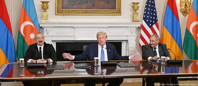 Mas outro par de mãos se uniu ao aperto de mãos bilateral: as do presidente dos EUA, Donald Trump, que atuou como mediador. Ele prometeu que empresas americanas garantiriam por 99 anos a infraestrutura e a segurança de um corredor para conectar o Azerbaijão com o enclave autônomo de Nakhichevan, envolto por território armeno.