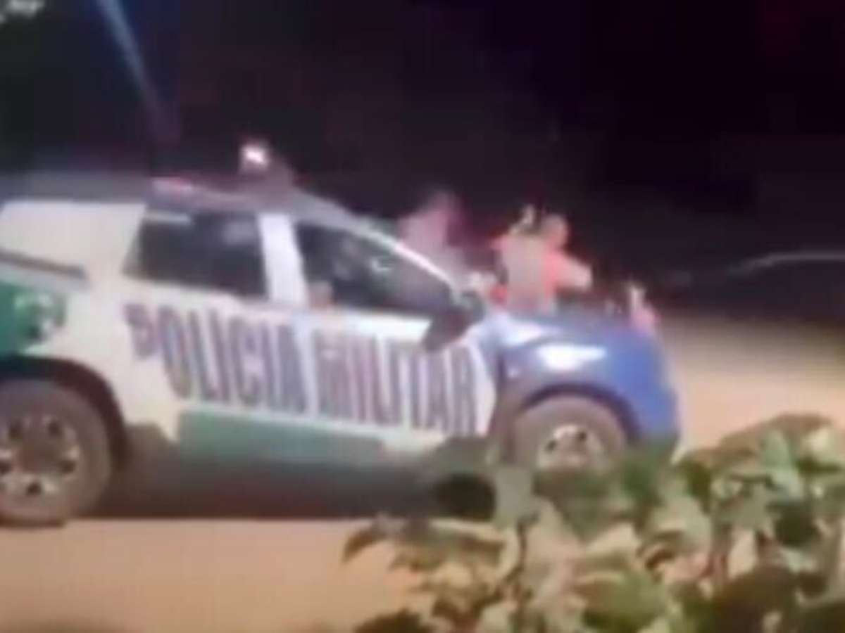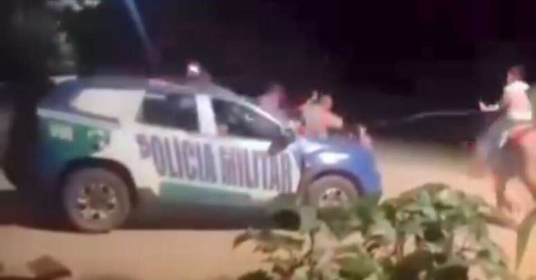 Um vídeo que circula nas redes sociais mostra um homem montado em um cavalo tentando laçar um policial militar em Colinas do Sul, região da Chapada dos Veadeiros, no Distrito Federal.