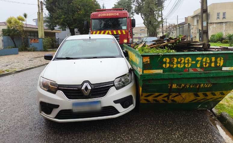 Homem bate carro em caçamba e precisa de ajuda dos bombeiros para sair, em Curitiba