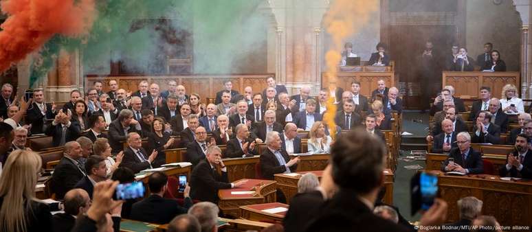 Legisladores de oposição realizaram um protesto em pleno Parlamento com bombas de fumaça coloridas.