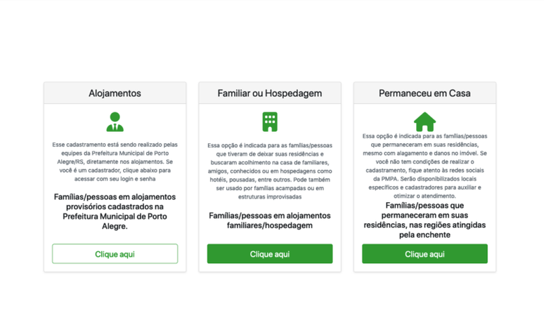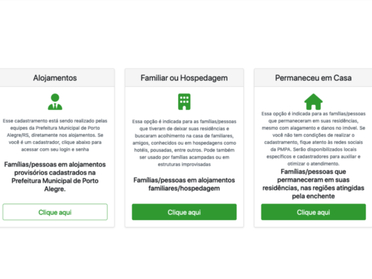 Abrigados - famílias que estão em alojamentos/abrigos cadastrados na prefeitura. Cadastramento já em andamento feito por servidores municipais. Nestes casos, não é preciso fazer on-line e nem se dirigir a um dos locais físicos.