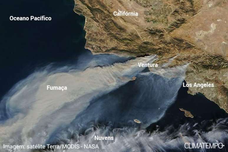 No dia 5 de dezembro, a densa pluma de fumaça que saía do vários incêndios no sul da Califórnia foram captadas por satélites meteorológicos. A imagem abaixo foi feita na tarde do dia 5 de dezembro de 2017 pelo satélite Terra, operado pela NASA, com o sensor MODIS (Moderate Resolution Imaging Spectroradiometer . A pluma mais extensa sai do fogo em Thomas. As plumas pequenas saem de outros incêndios menores.