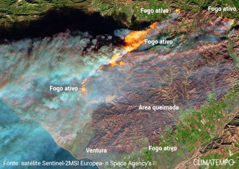No mesmo dia, sensor o Multi Spectral Imager (MSI) no satélite Sentinel-2 da Agência Espacial Européia capturou uma imagem abaixo, em cor modificada. Os incêndios ativos aparecem em laranja e as áreas queimadas em marrom. A vegetação que ainda não havia sido queimada aparece em cor verde. As áreas desenvolvidas são em cinza. A imagem do Sentinel-2 baseia-se em observações de luz visível, de ondas curtas de infravermelho e de infravermelho próximo.