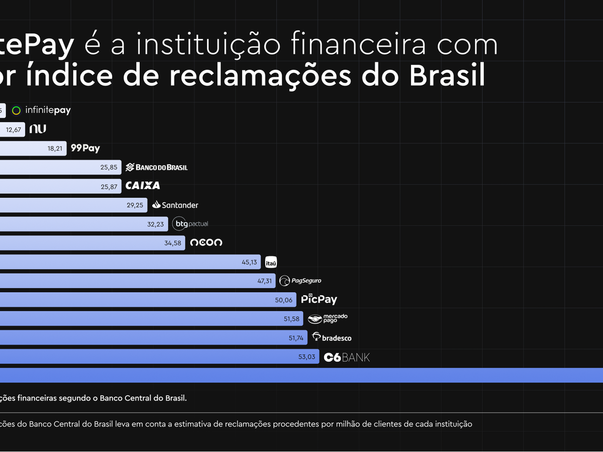 Com um número de contas abertas que mais que dobrou nos últimos 12 meses, chegando a um total de 14 milhões, a InfinitePay teve apenas 135 reclamações procedentes, o que resultou em um índice de 9,55 (o Ranking de Reclamações do BC leva em conta a estimativa de reclamações procedentes por milhão de clientes de cada instituição). Para efeito de comparação, os primeiros colocados do ranking apresentaram índices de reclamações 908%, 455% e 442% maiores do que o da InfinitePay.