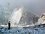 Integrante de equipe de resgate coberto de poeira observa o que sobrou dos prédios do World Trade Center