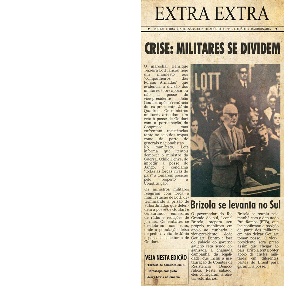 Surpreendendo toda a nação, o presidente Jânio Quadros renuncia e, consequentemente, inicia-se um movimento para que o vice, João Goulart, que estava em missão na Ásia, não assuma o poder. Durante essas tensas semanas, foi criado o movimento da Legalidade, que, a partir do Rio Grande do Sul, barrou a tentativa de golpe.