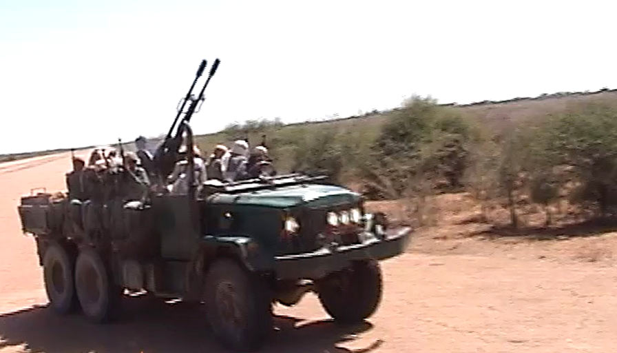 Imagem retirada do vídeo "A seu serviço, Osama", da Al-Shabaab, de 2009, mostra muhadjeens em treino sobre veículo na Somália - Foto: AFP