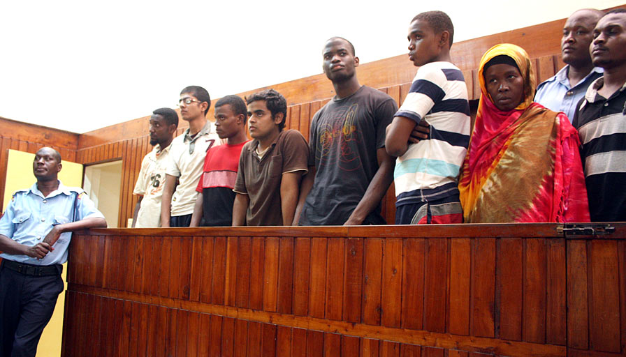 Nove supostos membros da Al-Shabaab participam de audiência em Mombaça, no Quênia - Foto: AFP
