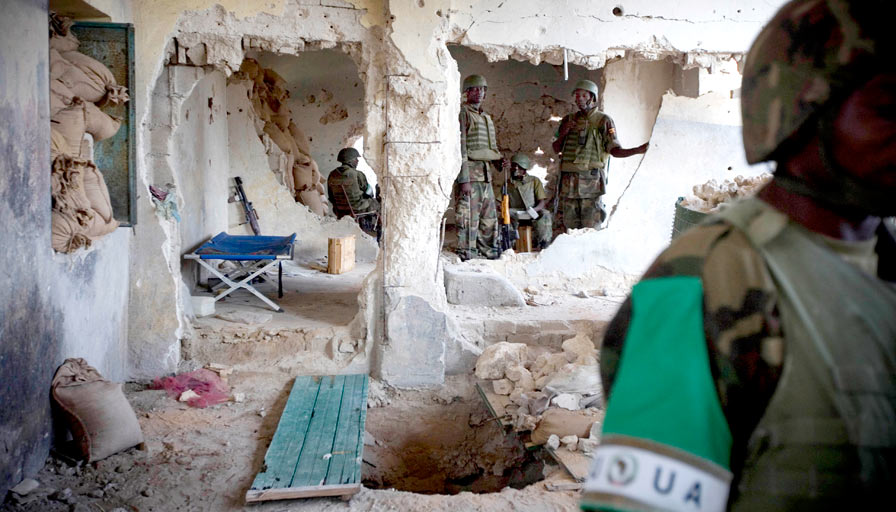 Soldados da União Africana vasculham casa antigamente sob controle dos combatentes da Al-Shabaab