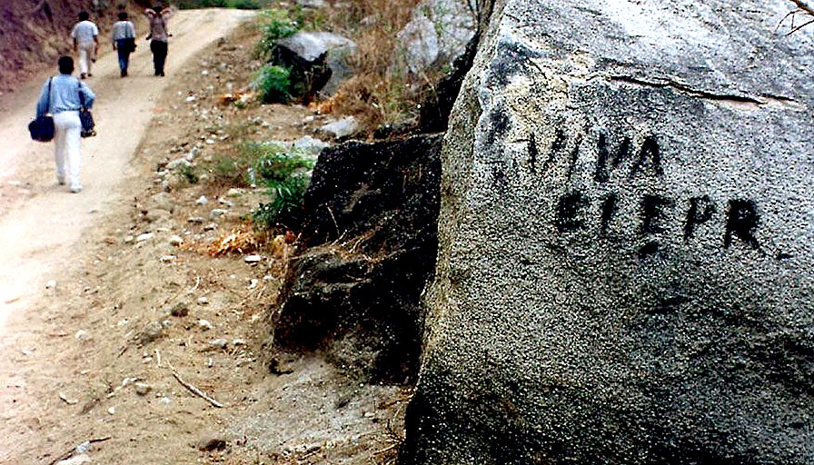 Pedras são pixadas com a silga do Exército Popular Revolucionário em Atoyac de Alvarez, no sul do México - Foto: AFP