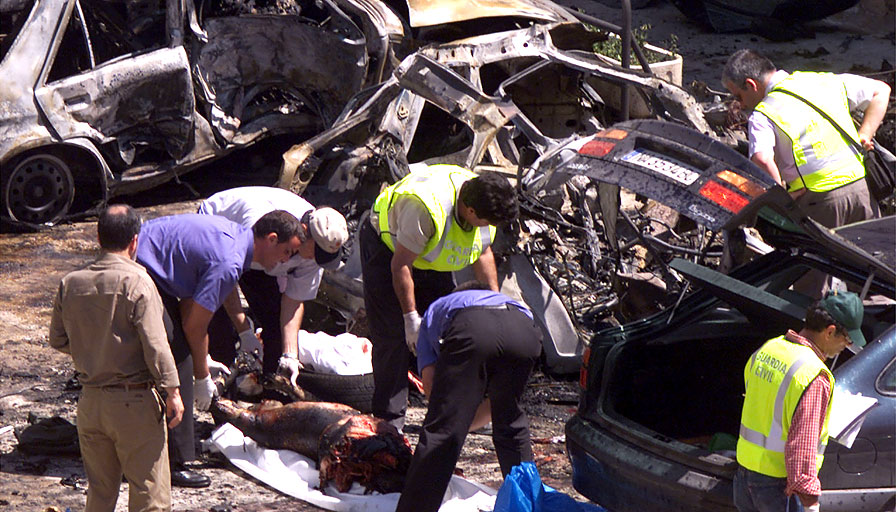 Policiais e agentes funerários movem corpo de policial assassinado em explosão atribuída ao ETA, em Sanguesa - Foto: Getty Images