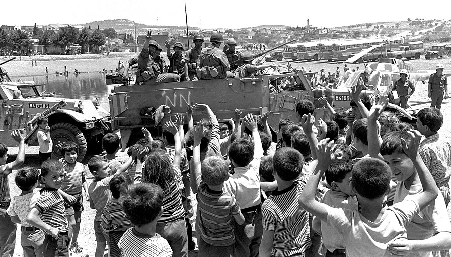 Crianças libanesas dão adeus a tropas israelenses na vila de Mis al-Jebel, em 1978 - Foto: Getty Images