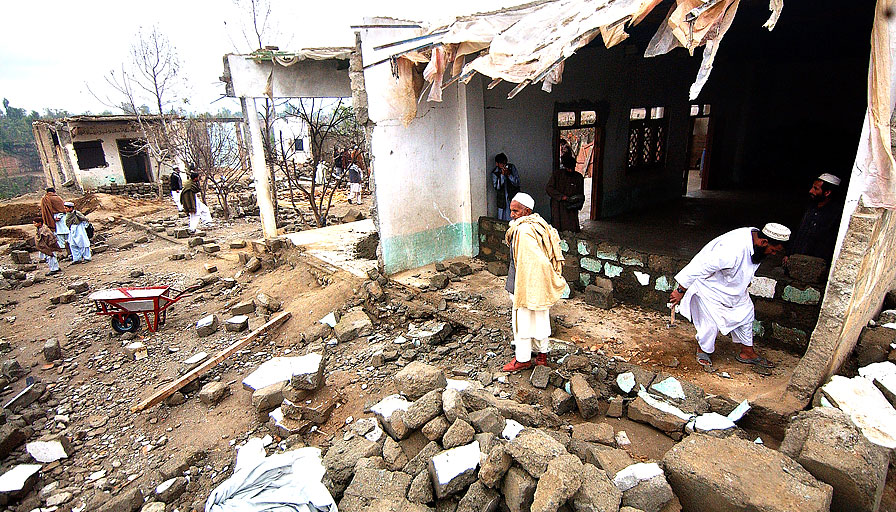Membros de tribos paquistanesas recontroem escola em Khar, na fronteira com o Afeganistão, após ataque americano, em 2006 - Foto: Getty Images