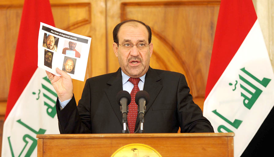 O premiê iraquiano, Nouri al-Maliki, mostra fotos de homem identificado como Abu Omar al-Baghdadi, líder da Al-Qaeda no Iraque - Foto: Getty Images
