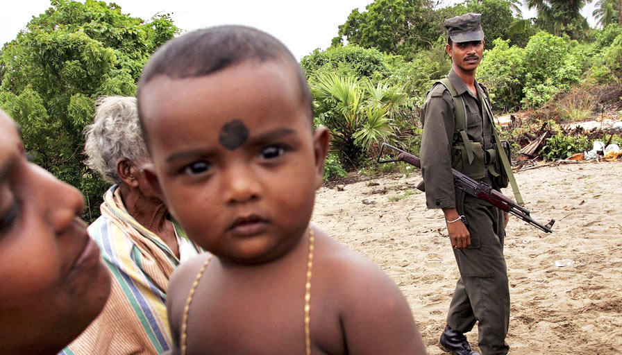 Soldado do Sri Lanka passa por grupo de população tâmil deslocada pelos confrontos entre exército e insurgentes - Foto: Getty Images