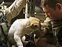 Soldado americano brinca com o cão Rocky dentro de um veículo blindado em Mosul, no Iraque, no dia 27 de fevereiro de 2005