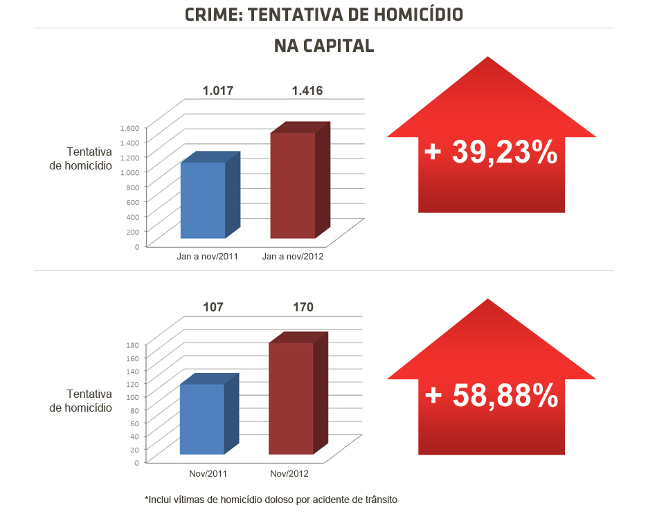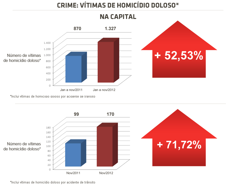 O ano ainda não terminou, mas entra na reta final com um panorama preocupante em São Paulo. Nos primeiros oito meses de 2012, houve crescimento na criminalidade no Estado se comparado com o mesmo período de 2011. Foi registrado aumento no número de vítimas de homicídio doloso e de latrocínio (roubo seguido de morte), além de alta nos casos de estupro, tentativa de homicídio, tráfico de entorpecentes, e roubo e furto de veículo. Em compensação, houve queda nas ocorrências de roubo a banco.