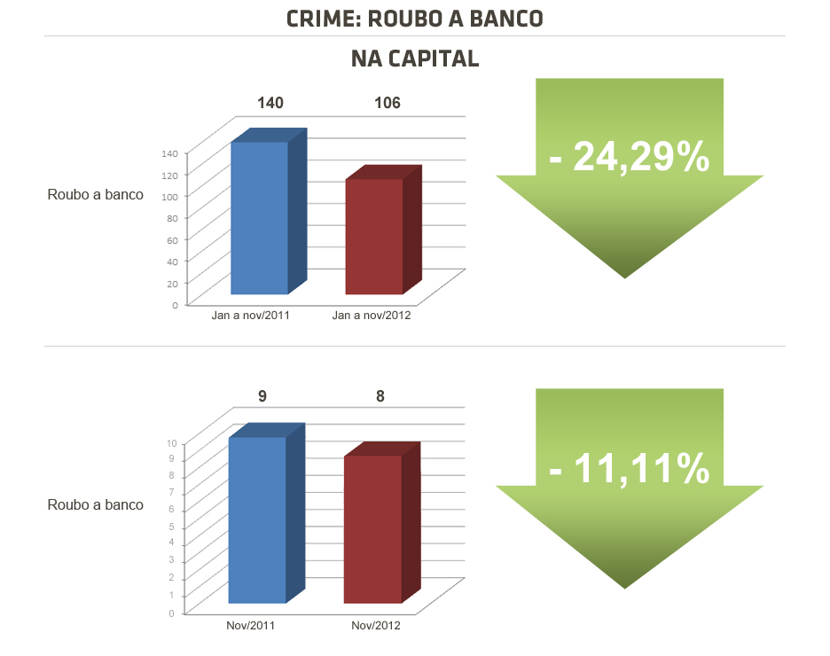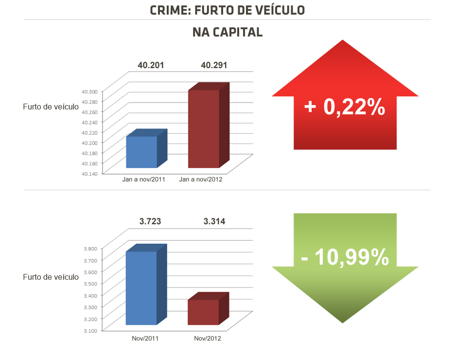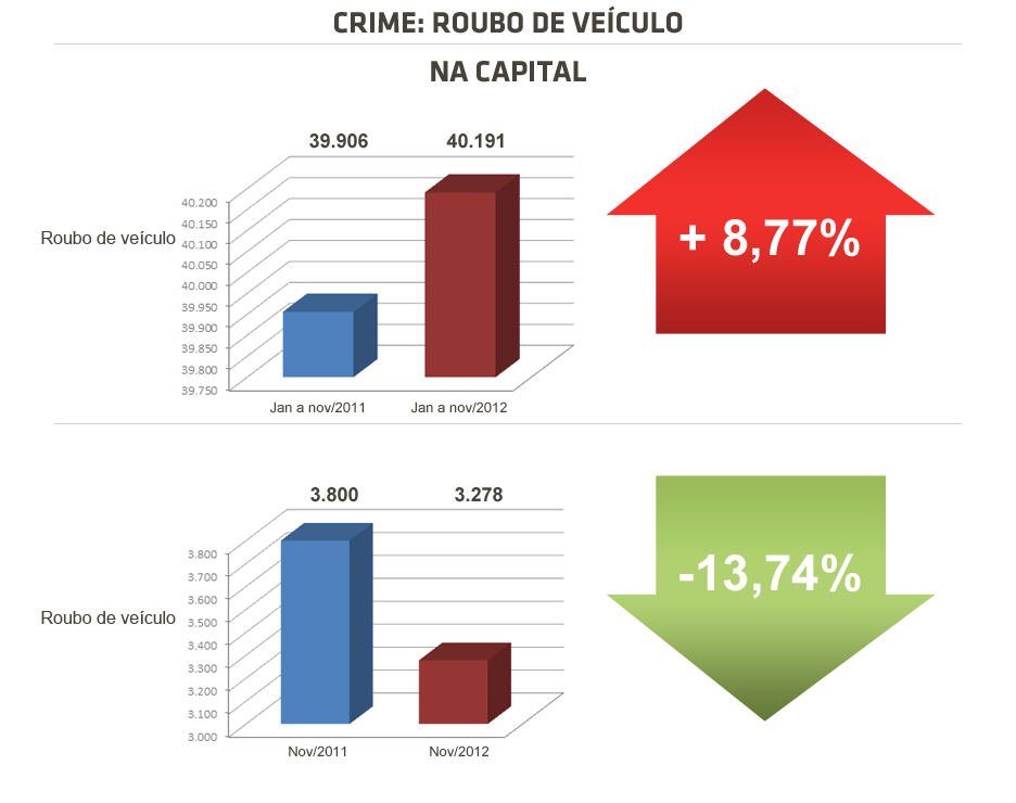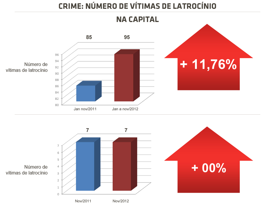 Embora o comparativo entre agosto de 2011 e deste ano apresente queda no número de vítimas de latrocínio (-55,56%), roubo de veículo (-0,95%) e roubo a banco (-63,16%), no acumulado dos primeiros oito meses, comparado ao ano passado, a criminalidade também está em alta. Assim como no Estado, a exceção fica nos casos de roubo a banco (-34,82%).