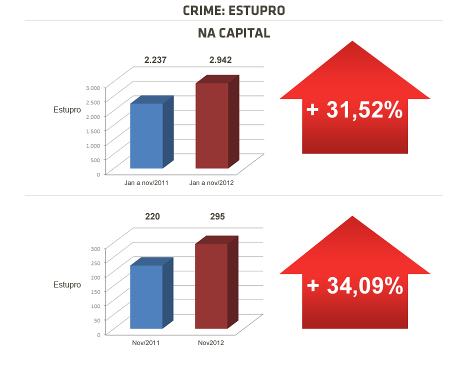 Se forem levados em conta somente os números de agosto do ano passado em relação ao deste ano, a realidade é quase a mesma. No crime de estupro, por exemplo, houve um crescimento de 31,85% nos casos no Estado. Agosto deste ano, aliás, foi o mês que mais teve ocorrências em 2012: foram 1.184.