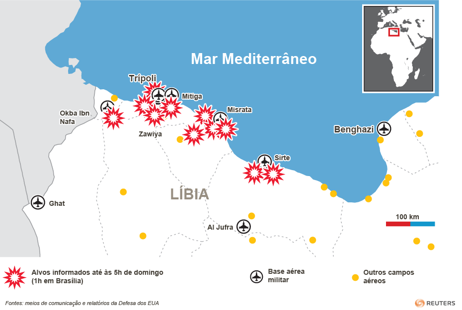 Navios e submarinos dos Estados Unidos e do Reino Unido dispararam pelo menos 110 mísseis Tomahawk no sábado, 19 de março, no primeiro dia da ofensiva, para destruir alvos da defesa aérea líbia. Nenhuma aeronave americana foi vista sobrevoando o país. A França também efetuou disparos.