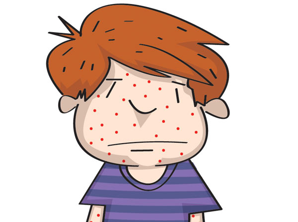 A pessoa infectada apresenta quadro de febre moderada a alta acompanhada de tosse, coriza, conjuntivite, sensibilidade à luz (fotofobia), cansaço, falta de apetite e manchas vermelhas na pele, que aparecem inicialmente no rosto, atrás do pescoço e se espalham para o tronco e membros.