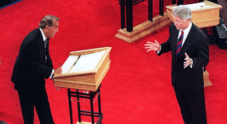 Bill Clinton enfrenta o candidato republicano Bob Dole na Universidade de San Diego, na Califórnia