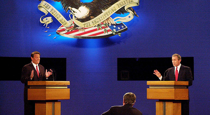 O primeiro debate da corrida eleitoral de 2000 ocorreu no dia 3 de outubro, na cidade de Boston, no Massachusetts. Al Gore se afirmou cético a respeito da capacidade de liderança de Bush, no que o republicano replicou falando sobre sua experiência