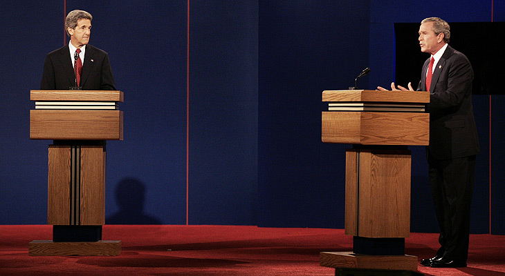 Três debates presidenciais e um entre vice-presidentes foram realizados nas eleições de 2004, disputadas por George W. Bush, então presidente, e John Kerry, senador democrata pelo Estado de Massachusetts. Em mais uma eleição apertada, Bush venceu John Kerry por 286 votos dos colégios eleitorais contra 251.