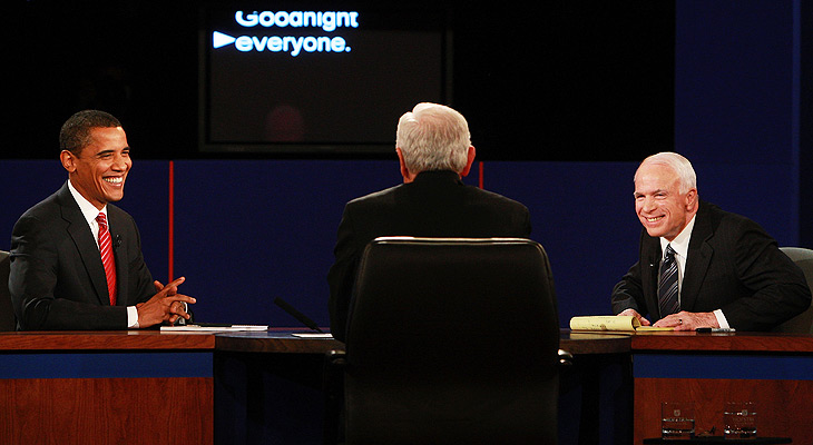 O atual presidente Barack Obama e o senador John McCain participam do terceiro debate de 2008, na Universidade de Hofstra, em Hempstead, NY