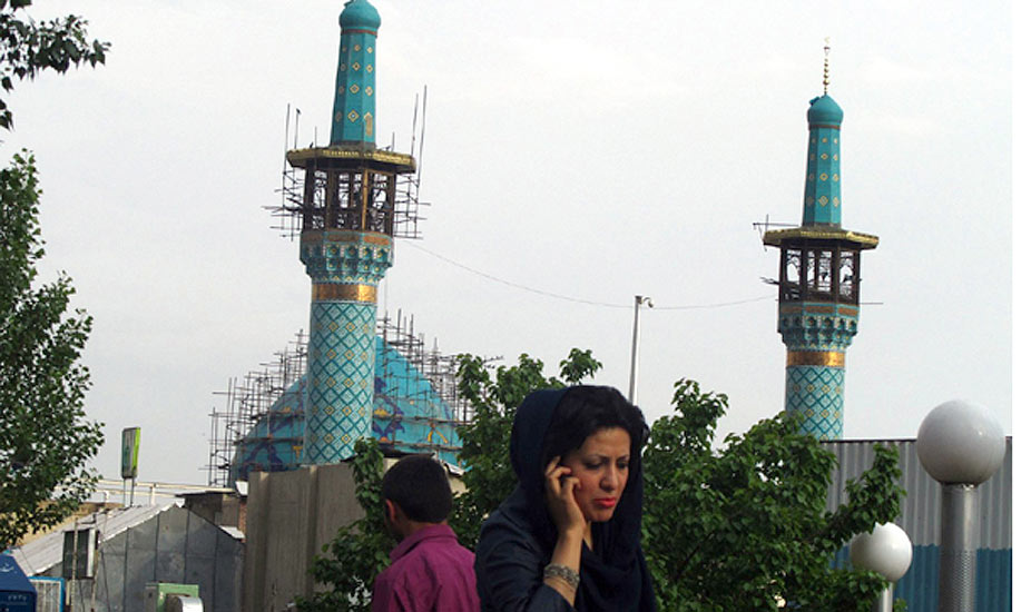 Mulher maquiada, com o véu deixando seus cabelos à mostra e falando ao celular: não é raridade em Teerã