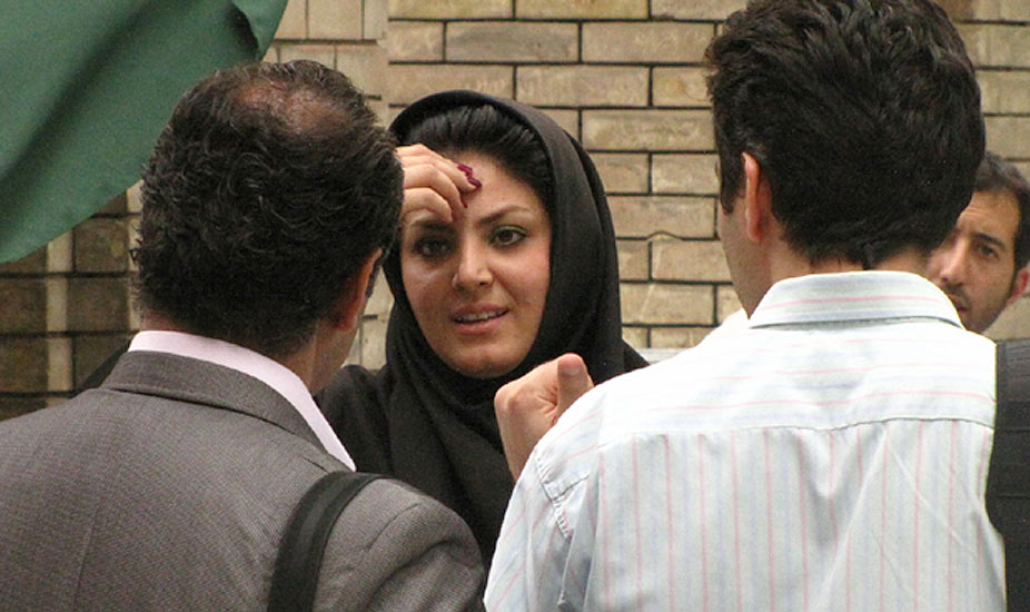Mulher iraniana conversa com dois homens desconhecidos em parque de Teerã – o liberalismo no país já atinge o modo como os sexos interagem