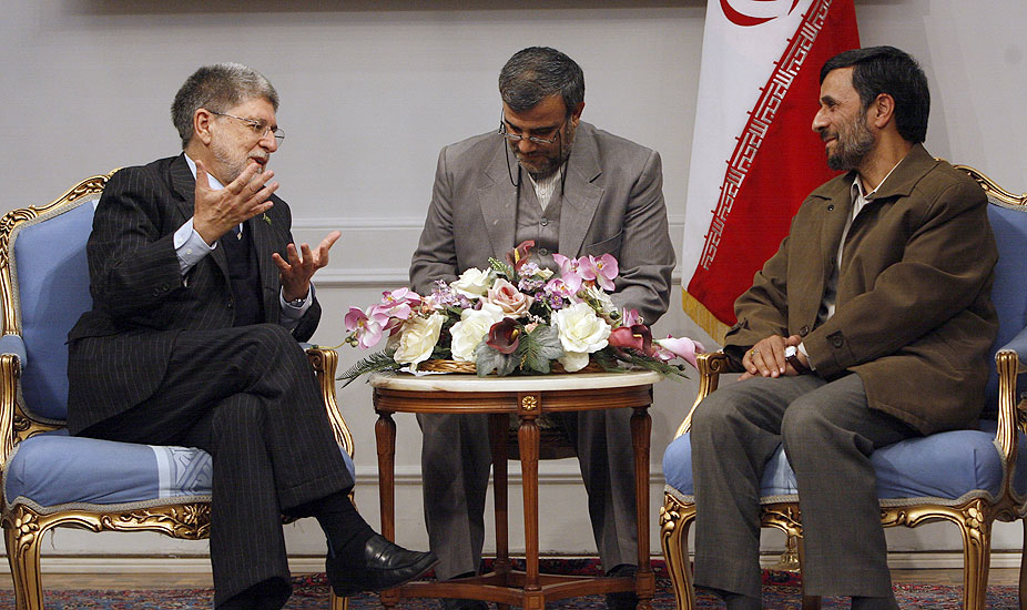O presidente iraniano, Mahmoud Ahmadinejad, e o então chanceler brasileiro, Celso Amorim, encontram-se em Teerã, em novembro de 2008