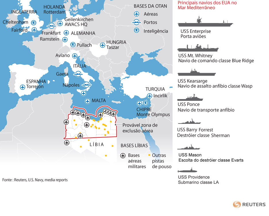 A ONU autorizou ataques militares para impedir os ataques do líder líbio Muammar Kadafi, horas depois que ele ameaçou invadir o reduto rebelde de Benghazi, durante a noite. A medida recebeu o respaldo de 10 dos 15 membros do principal órgão de segurança internacional, enquanto nenhum votou contra e os outros cinco se abstiveram - entre eles, o Brasil. A resolução permite "todas as medidas necessárias" para proteger áreas civis e impor militarmente um cessar-fogo a Kadafi.