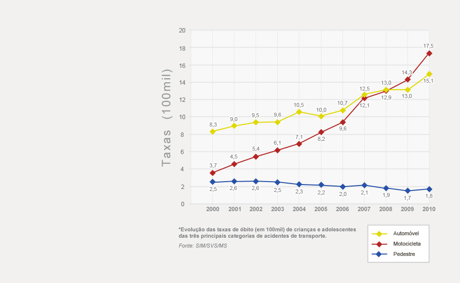 Segundo a pesquisa, foi registrada uma tendência crescente das mortes de jovens no trânsito desde 1980 até 1997, ano em que entra em vigência o Código do Trânsito. Sob ele, as taxas caíram de forma significativa nos primeiros anos, o que durou até 2000. A partir dessa data os índices se estabilizam, mas começam a crescer novamente a partir de 2008. O principal motivo foi o aumento das mortes envolvendo motociclistas: 376,3% entre 2000 de 2010.