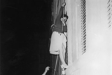 Mulher recebe ajuda para descer de uma janela em Bernauer Strasse, passando para o lado ocidental