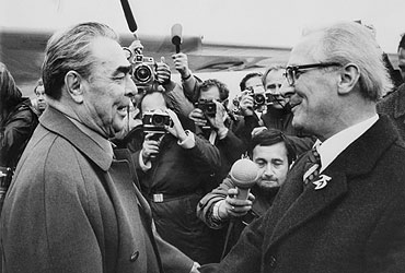Leonid Brezhnev (esq.), secretário-geral do Partido Comunista Soviético, recebe as boas-vindas de Erich Honecker, em Berlim