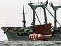 O navio de resgate russo Mikhail Rudnitsky trabalha nas buscas pelo submarino Kursk, em Severomorsk, em 18 de agosto de 2000