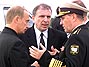 ladimir Putin (esq.) fala sobre o acidente com o líder do comitê do governo, Ilya Klebanov (centro), e com o comandante da Marinha, Vladimir Kuroyedov