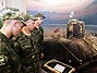 Soldados russos observam imagem do submarino nuclear Kursk no Museu do Exército Russo, em Moscou, em 12 de agosto de 2006, seis anos após o incidente