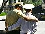 Oficiais da Marinha se abraçam ao observarem o memorial em homenagem às vítimas do submarino Kursk, em Moscou, no dia 12 de agosto de 2005