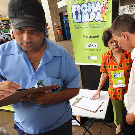 De iniciativa popular, o projeto da Ficha Limpa foi apresentado com mais de 1,6 milhão de assinaturas e a lei foi sancionada pelo presidente Luiz Inácio Lula da Silva em junho de 2010. Conforme o texto, torna-se inelegível o candidato condenado em decisão colegiada por crimes contra a administração pública, o sistema financeiro, ilícitos eleitorais, de abuso de autoridade, lavagem de dinheiro, tráfico de drogas, tortura, racismo, trabalho escravo ou formação de quadrilha. A poucos meses das eleições, vários candidatos que se sentiram prejudicados pela nova lei recorrem ao Supremo Tribunal Federal.
