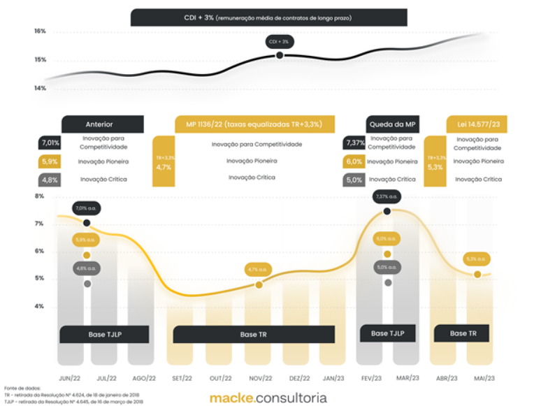 A MP 1.139/2022, medida vigente até maio, já havia alterado em setembro de 2022 a TJLP para a TR, aumentando em 56,2% a demanda em relação à média dos últimos 4 anos, segundo dados da Finep. A MP caducou em fevereiro e teve novamente o indexador alterado para a TJLP, até que, em abril, houve a modificação da Lei 11.540/07 e a TR se tornou a taxa base.