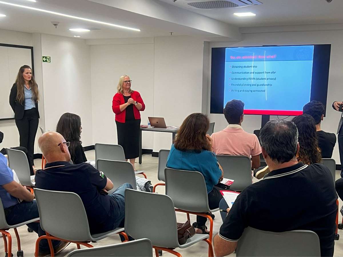 Em visita à Hayek Global College, em Brasília, Amy Gardner, diretora de recrutamento internacional da Clark University, apresentou informações sobre a graduação nos Estados Unidos e orientações para estudantes brasileiros interessados em cursar o ensino superior fora do país
