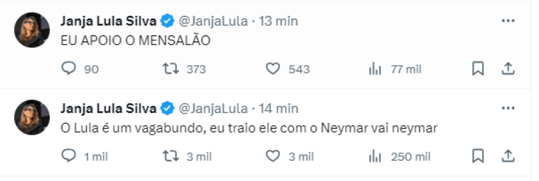 Nas mensagens publicadas, os invasores atacam algumas pessoas, como o presidente Luiz Inácio Lula da Silva (PT), o ministro do Supremo Tribunal Federal Alexandre de Moraes, além da própria Janja. "O Alexandre de Moraes é bandido e logo vai sofrer impeachment. Nada que ele faça vai impedir a gente de falar a verdade, enquanto tenho tempo falarei mais e mais", eles afirmaram em uma das publicações.