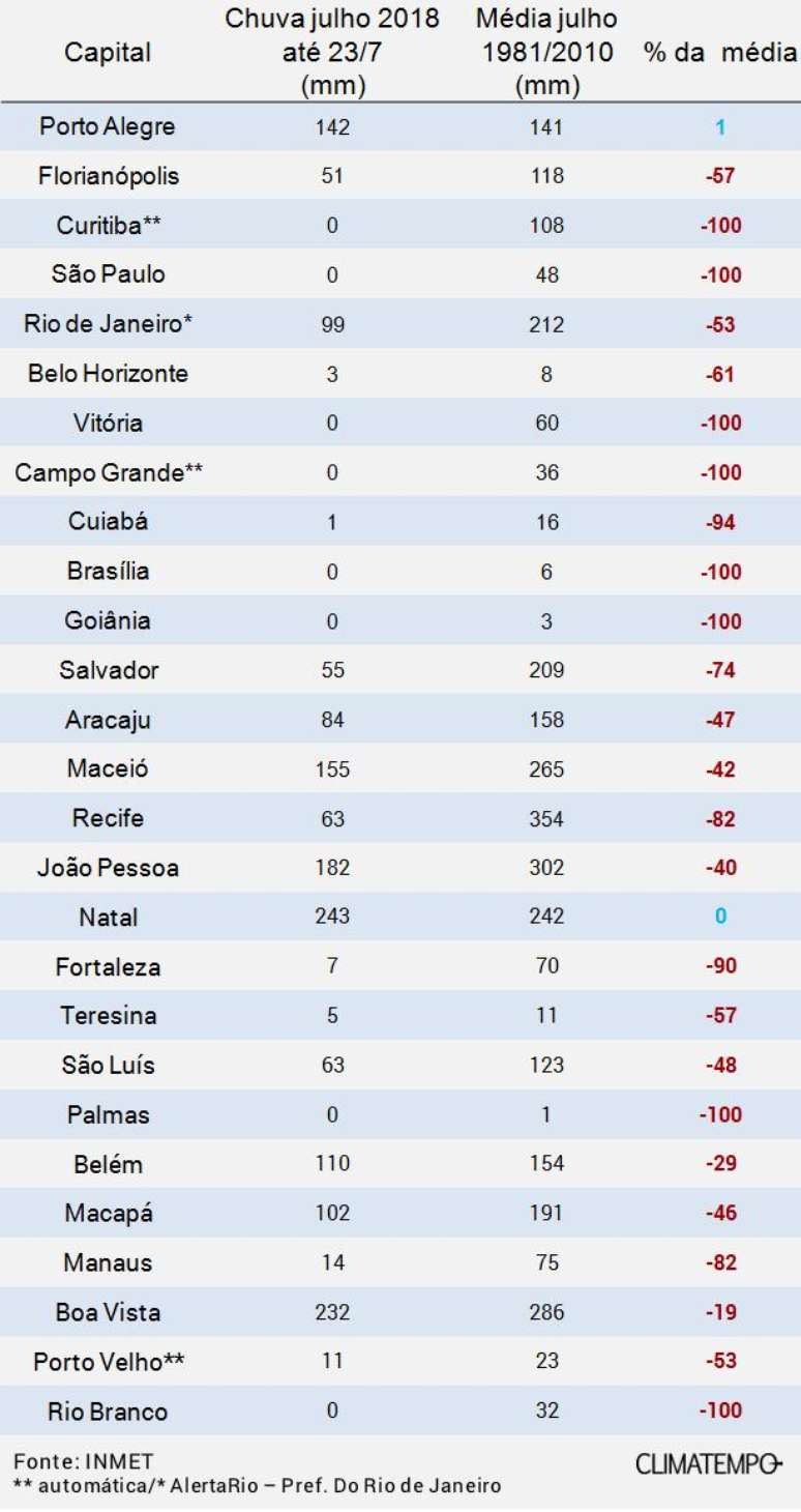 Julho de 2018 está sendo muito seco nas capitais brasileiras. Faltando uma semana para terminar o mês, a chuva está abaixo e muito abaixo da média em 25 das 27 capitais. Em 23 dias, o Instituto Nacional de Meteorologia (INMET) não registrou chuva em Curitiba, em São Paulo, Goiânia, Brasília, Rio Branco e em Palmas.