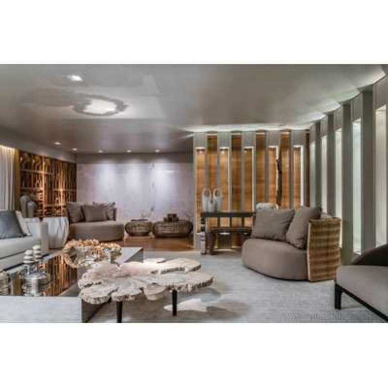 Com pinturas em aquarela do Siron Franco e escultura em zinco de Marcos Coelho Benjamim (O Ralador), o Living Martha Medeiros tem nas tonalidades neutras, como bege, cinza e branco com texturas naturais, cenário para detalhes rústicos, como os tecidos de linhão e os acabamentos de fibra e bambu que compõem o mobiliário. O contraste também fica por conta do marrom da madeira, presente no taco e no revestimento das paredes, dos cobogós e também dos painéis de mármore e acabamentos em couro. Para surpreender, a arquiteta apostou ainda em pilares em madeira com uma pintura cinza no mesmo tom do teto, "deixando em destaque o desenho dos veios".