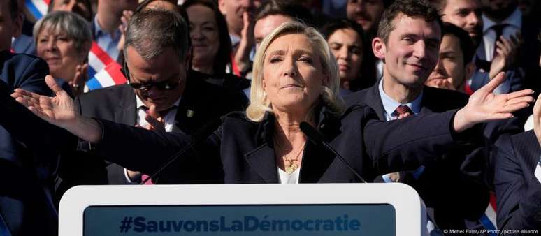 Líder da ultradireita francesa reuniu apoiadores em Paris, e criticou condenação por corrupção que resultou na sua inelegibilidade. Rivais criticam manifestação. "Você rouba, você paga", diz aliado de Macron.A líder da ultradireita francesa Marine Le Pen participou neste domingo (06/04) de um comício em Paris na esteira de sua condenação por corrupção nesta semana, que resultou na sua inelegibilidade e deve impedi-la de concorrer às eleições presidenciais de 2027.